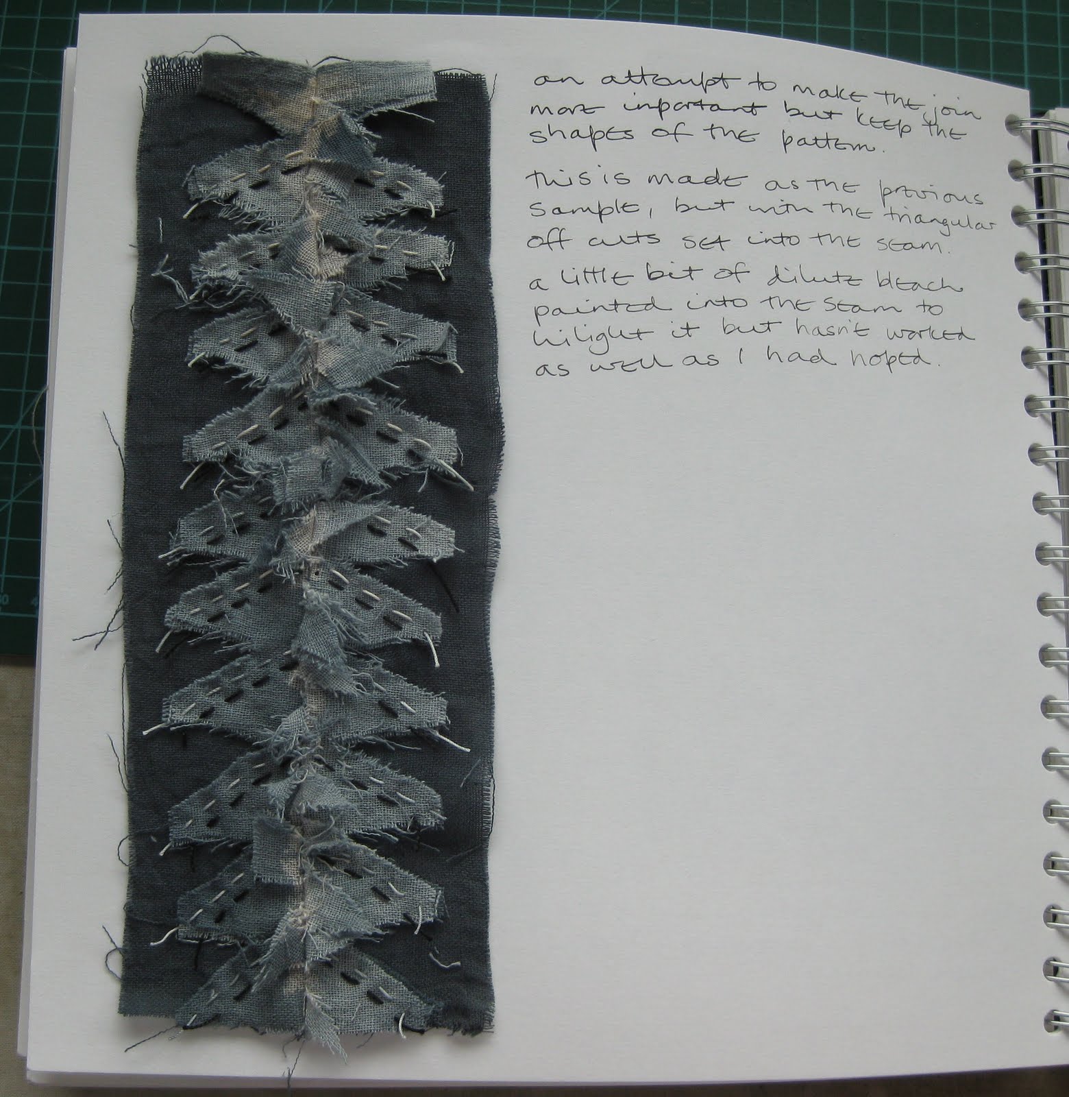 The fabric for the three remaining samples was made using white emulsion paint to create marks and textures on a piece of calico, and then painted with acrylic paint when dry. Texture and pattern was then applied using soft gel matte medium, and finally a little bit of embroidery.